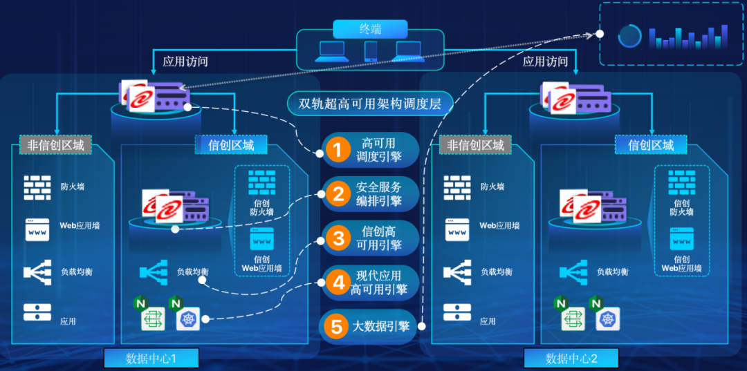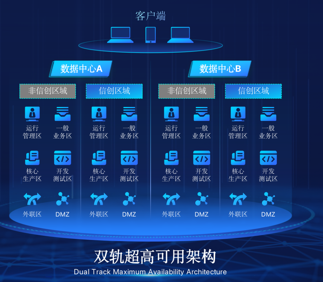 神州9500金沙在企业面临自主创新IT基础重构过程中,推出的全新架构双轨超高可用架构(简称DTMAA),在双活数据中心的分区调度基础上,添加每个数据中心内信创域和非信创域的分域调度,来实现分区分域协同的多活双轨超高可用。