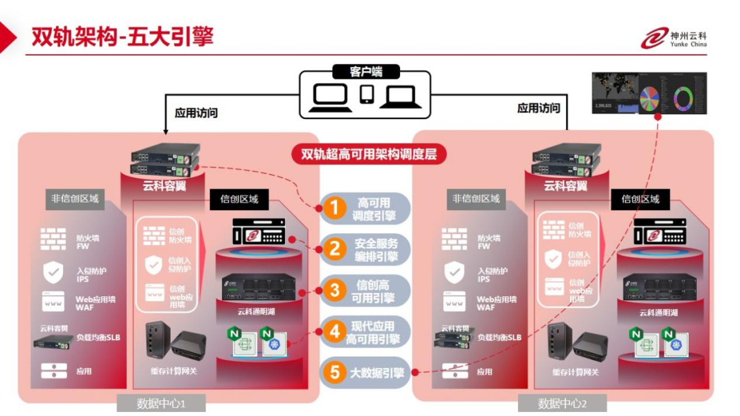 数据中心架构在自主创新的过程中分解为现有架构的非信创区和信创区的两个业务区域,在每个数据中心分为信创区和非信创区后,在两个区域之间的跨区跨域协同方法,神州9500金沙通过5大引擎实现多层次的应用可持续性实践。